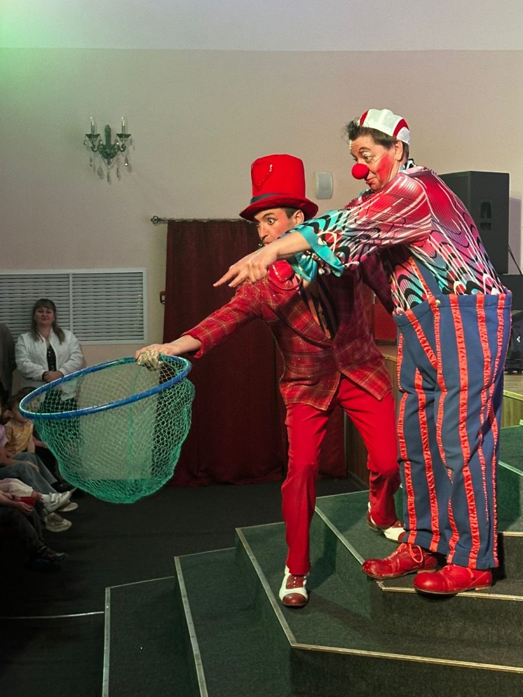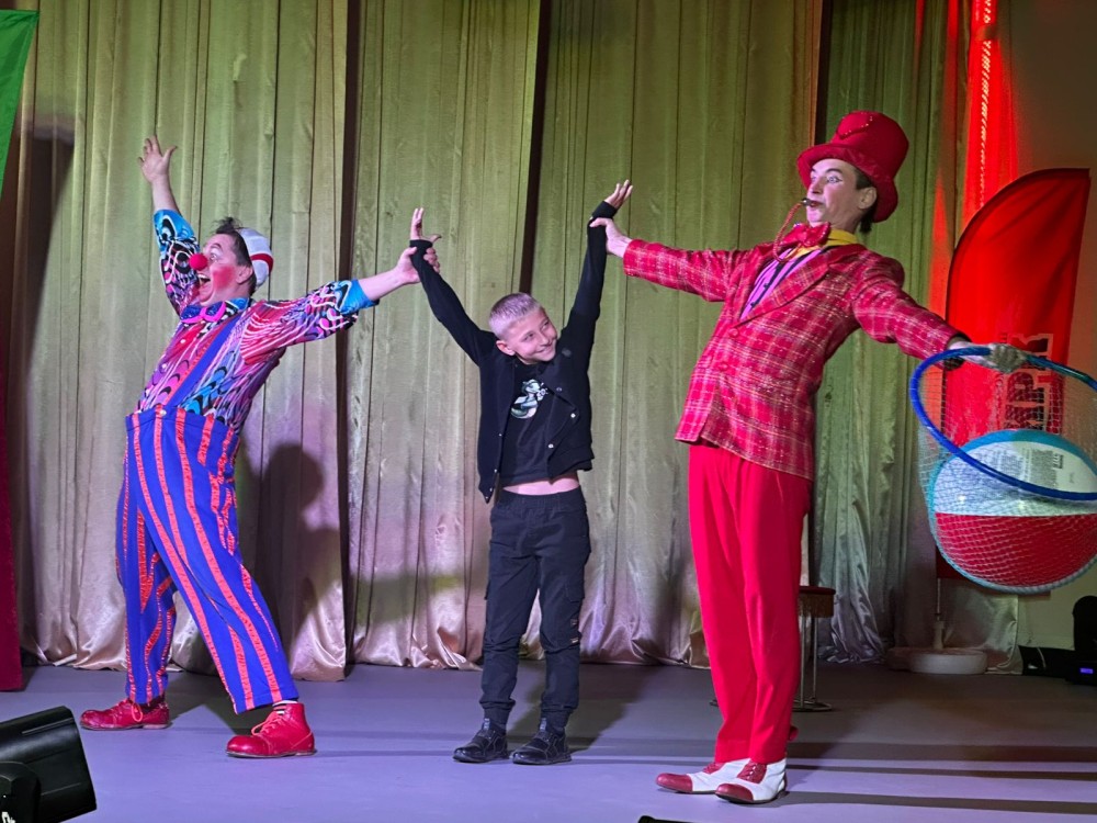 На сцене Центра культуры и искусства с ребятами шутили и удивляли репризами клоунский искрометный дуэт «Не соскучишься» в исполнении династийных артистов Дениса Банникова и Дениса Ющенко! Обладая природным талантом, клоуны создали уникальную атмосферу праздника, в которой каждый зритель мог почувствовать себя частью циркового волшебства. Их комические сценки полны неожиданных поворотов и забавных ситуаций, которые заставляют смеяться даже самых серьезных зрителей. Цирк, как и музыка - искусство, понятное всем. Клоуны - виртуозы своего дела! И кроме клоунады владеют огромным арсеналом жанров!