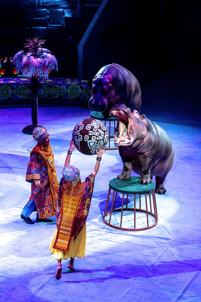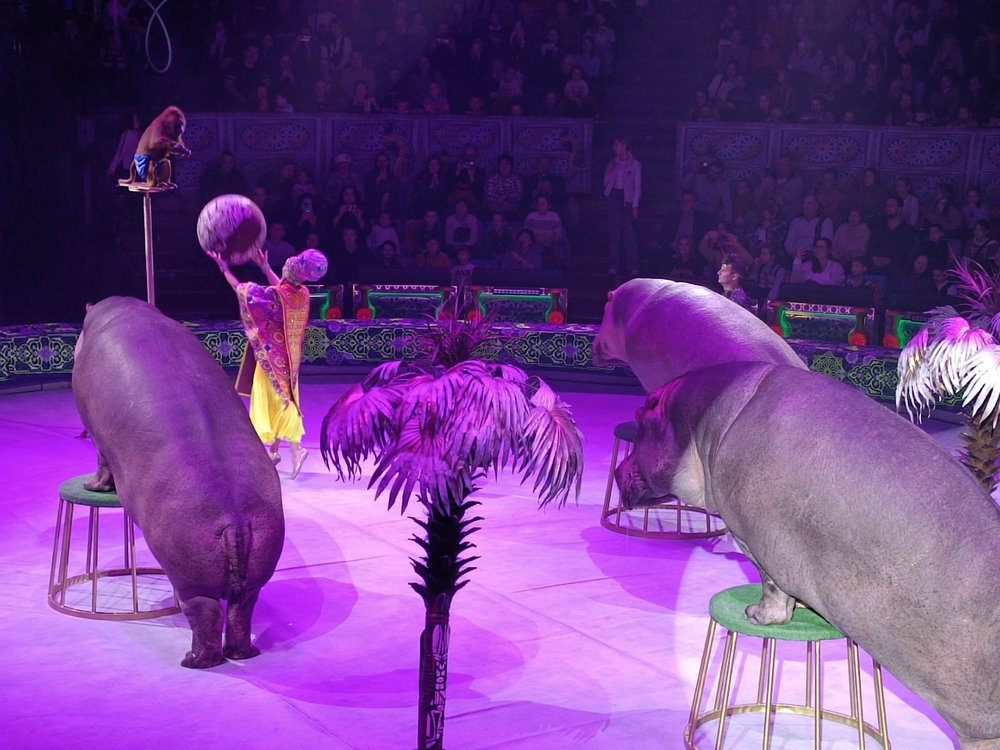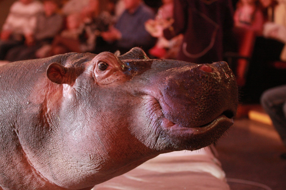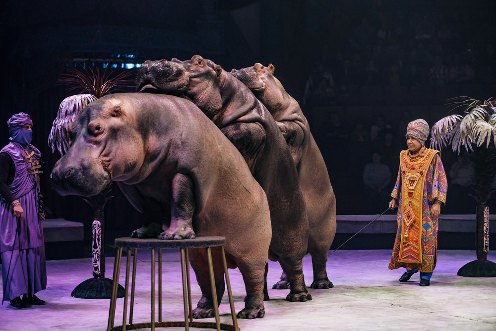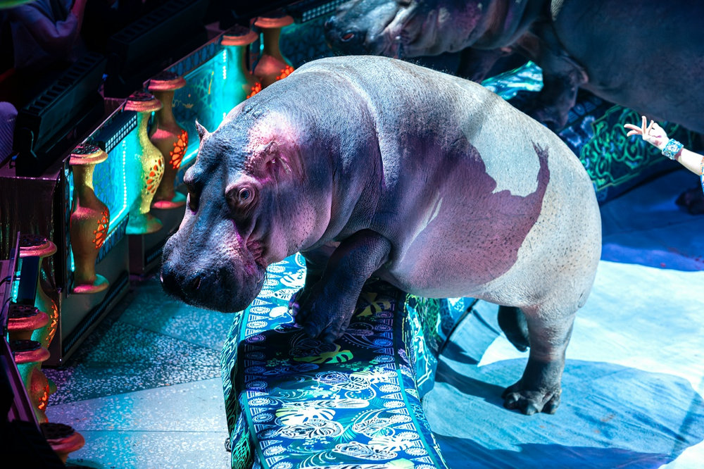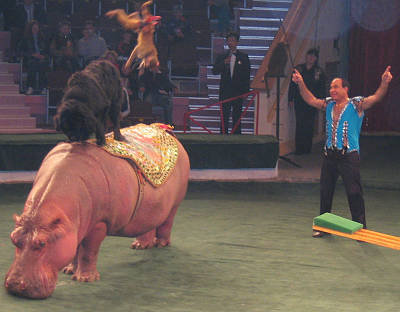 Бегемоты выступают в цирке – это большая редкость. Главное правило - отталкиваться от физиологических данных животного. Если медведя можно научить кататься на коньках и роликах, а сивуча танцевать брейк-данс, то с гиппопотамами все гораздо сложнее. Их невозможно поставить на передние или задние ноги, потому что в природе они этого не делают. Слона можно на голову поставить, бегемота - нет. «По сравнению с бегемотами дрессура обезьян - детский лепет!» По словам дрессировщика Тофика Ахундова, у бегемотов очень сложный характер, плюс они очень ленивы. Их любимое занятие - лежать, спать и есть.